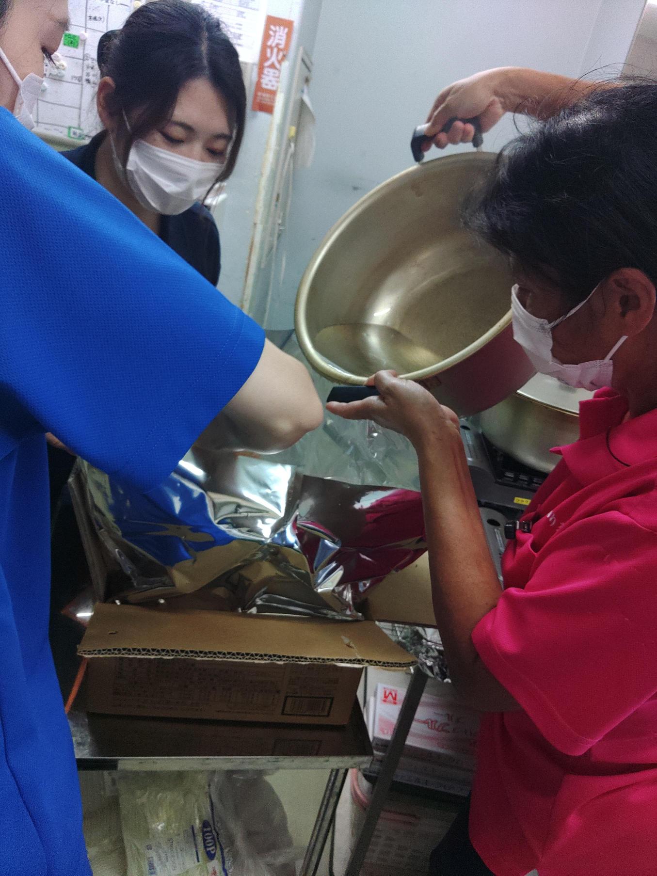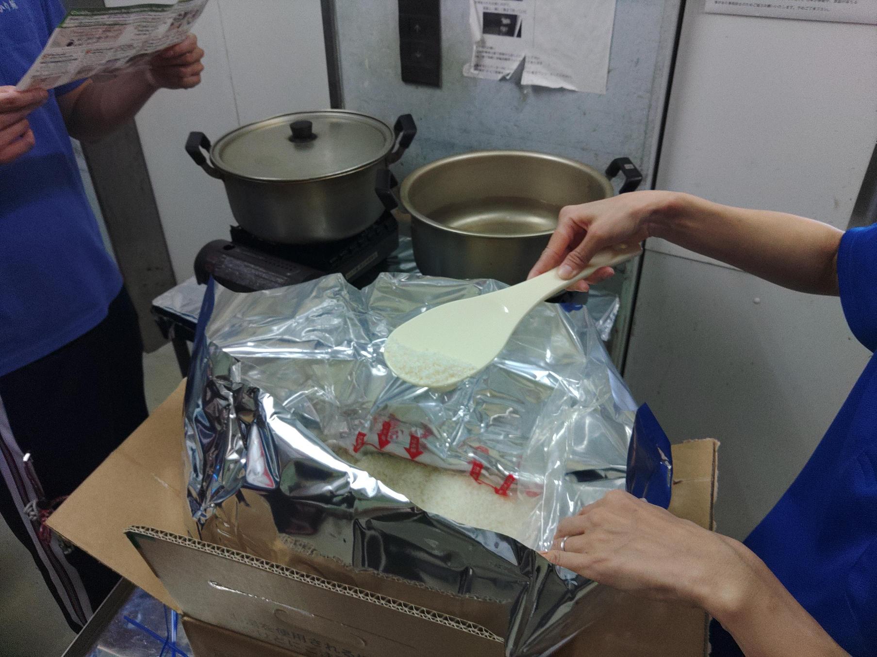 段ボールにて保管していたアルファ米を実際に食べられる状態に調理?しました。